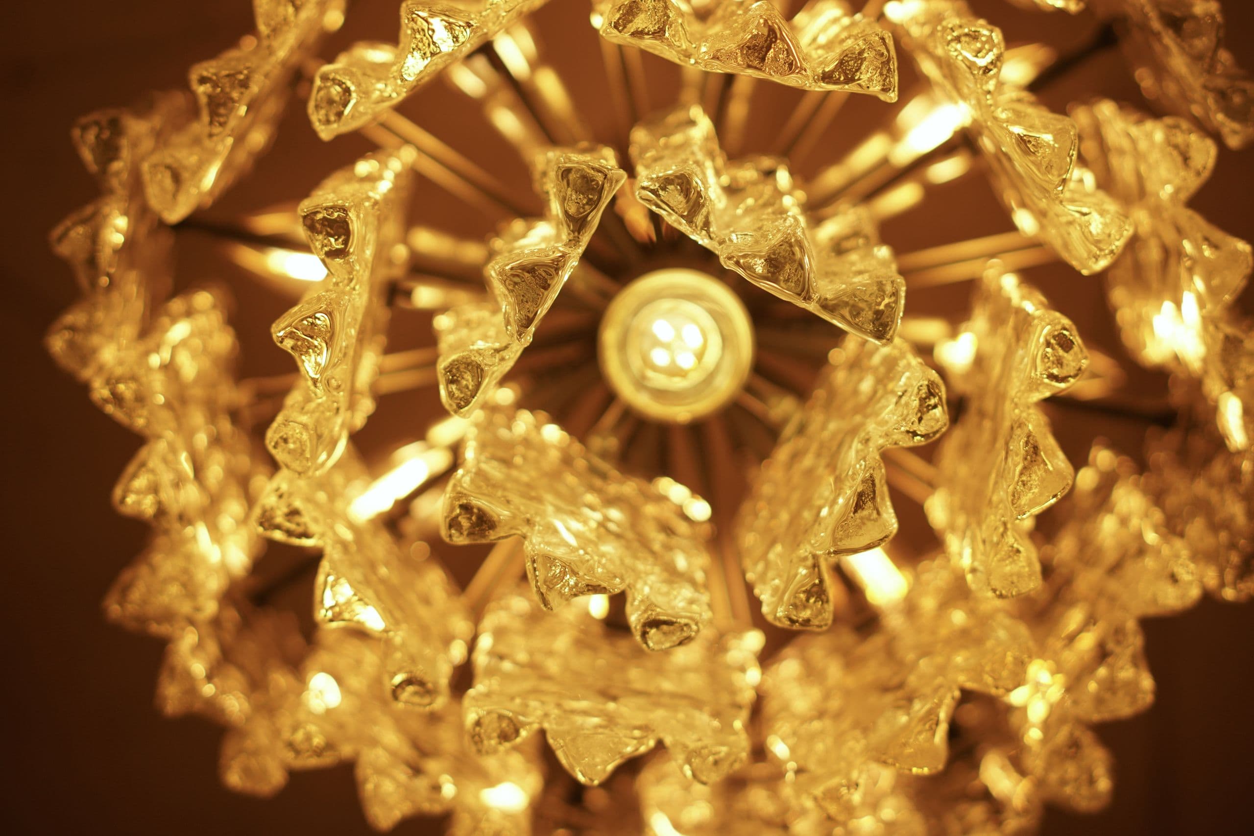 The chandelier features 27 hand-cast Murano “ice glass” elements mounted on a nickel-plated metal structure.